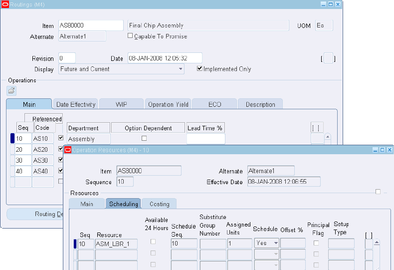 This includes item number, alternate routing designator, revision, operation sequence, operation code, department, effective date, effective time, disabled date and disabled time. See: Creating a Routing, Oracle Bills of Material User's Guide.