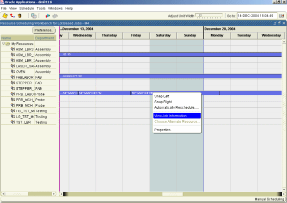Launch the Resource Scheduling Workbench by navigating to the Resource Scheduling Workbench for Lot Based Jobs window from the Resource Scheduling Workbench menu item in Oracle Shop Floor Management responsibility.