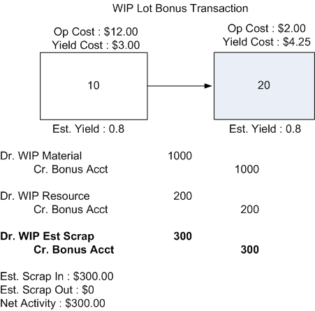 You can create bonus lots to perform operations on assemblies that were previously scrapped. The quantity starts in the intraoperation step of queue of the starting operation. Therefore, components at the starting operation are not automatically charged when the bonus lot is created. The standard cost of the assembly through the previous operation is credited to the bonus account. The account is often the scrap account. Operation yield is calculated for all previous operations, based on standards.