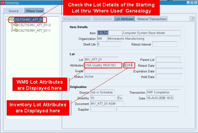 The Lot Attributes tab displays WMS lot attributes and Inventory lot attributes.