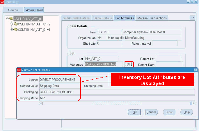 You can view historical information for lot-based jobs in the Lot Genealogy window. This graphical interface provides an integrated view of genealogy information for discrete jobs, lot-based jobs, and Oracle Warehouse Management inventory transactions. You can view both material and lot-based job transaction information.