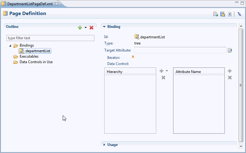 list, and enter the Id. Then click OK. The binding is added to the Outline section in the page definition editor.