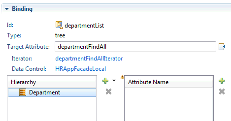 - Add and edit attributes for new bidings on the right side of the Page Definition editor. Click on the page icon for Target Attribute. In the Edit Tree Binding dialog, select the data collection to bind. Click OK.