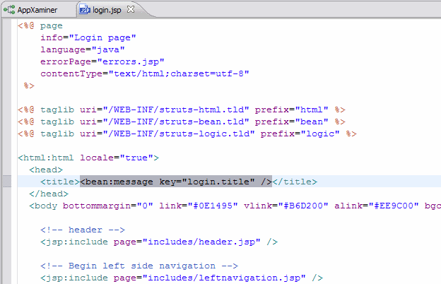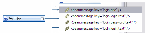 By clicking one of the references you navigate to the corresponding reference location in the referring file. Figure 5 shows an example of how clicking on bean:message key="login.title" from the login.jsp file would opens the appropriate reference in in the source view.