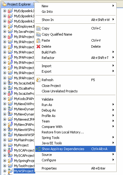 - Right-click your Web project in the Project Explorer and select Show AppXray Dependencies from the drop-down menu, as Figure 3 shows. This opens the AppXaminer view.