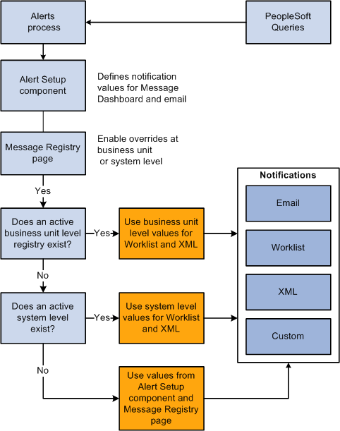 The Alert Setup component defines values for the Notification Dashboard and email notifications. The BU-Level Notifications page or the System-Level Notifications page define values for the PeopleSoft Worklist and XML notifications. If there are no entries on the BU-Level Notifications page for the process name and the process category, then the PeopleSoft system checks to see if the values have been defined at the system level using the System-Level Notifications page.