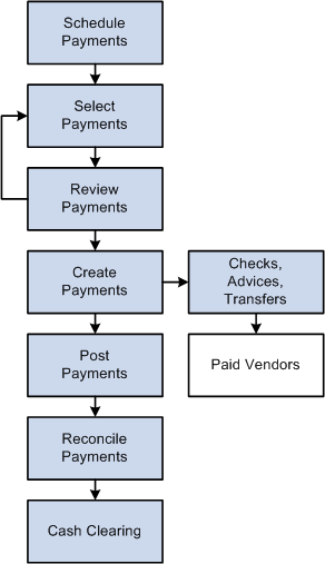 To understand how to set up the Pay Cycle process to meet your organization's needs, you should see how the Pay Cycle process fits in the larger PeopleSoft Payables payment process flow: