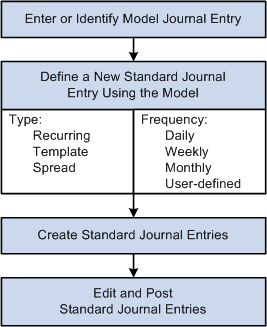 In General Ledger, standard journal entries (SJEs) enable you to automate the entry of similar or identical journals. There are three types of SJEs: recurring, template, and spread. A recurring journal entry is any entry that is periodically generated according to a schedule, such as monthly rent, lease payments, and depreciation expenses. A template journal entry is a data-entry model for other journals that you can automatically reproduce on a fixed schedule—like recurring SJEs—or use on request. A spread journal entry is an entry in which the entire journal's amount is spread proportionately across the different periods.
