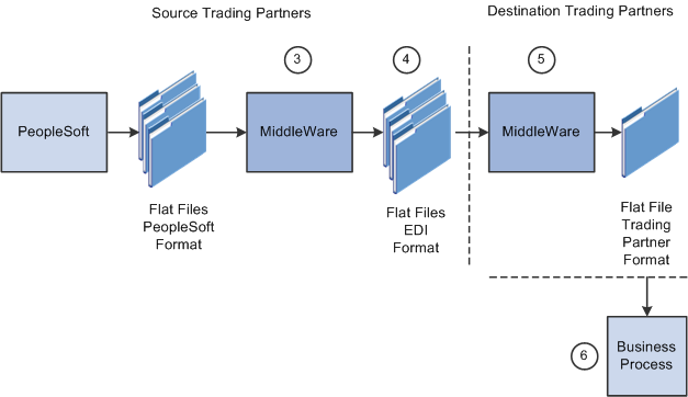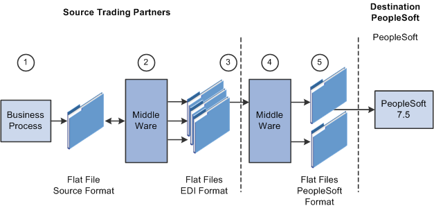 A middleware tool is used to convert the source file into the appropriate PeopleSoft Business Document file format. This process includes a conversion from the sources EDI format (X.12, EDIFACT and so on). Additional translation requirements may be required if the source trading partner is sending a generic file that does not meet the destination trading partner's data requirements.