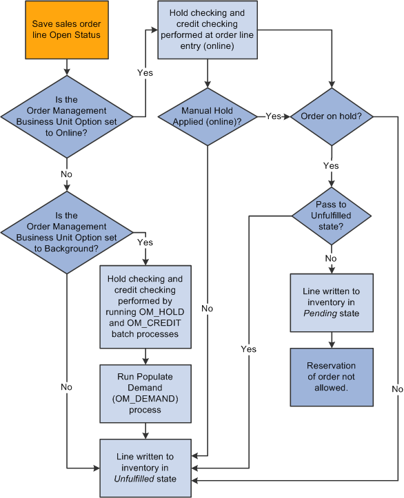 The system can perform hold checks online at order entry or use two processes: Automatic Hold Check and Automatic Credit Check to periodically review quote and order headers, lines, and schedules to apply and release holds. A third process, Populate Demand, sends demand data to PeopleSoft Inventory for orders with released holds, if the order schedule is saved in an open status. If the order schedule is saved in pending status and is subsequently released manually from hold, changing the status to open sends the demand data to PeopleSoft Inventory. In this case, the Populate Demand process need not be run for that order.