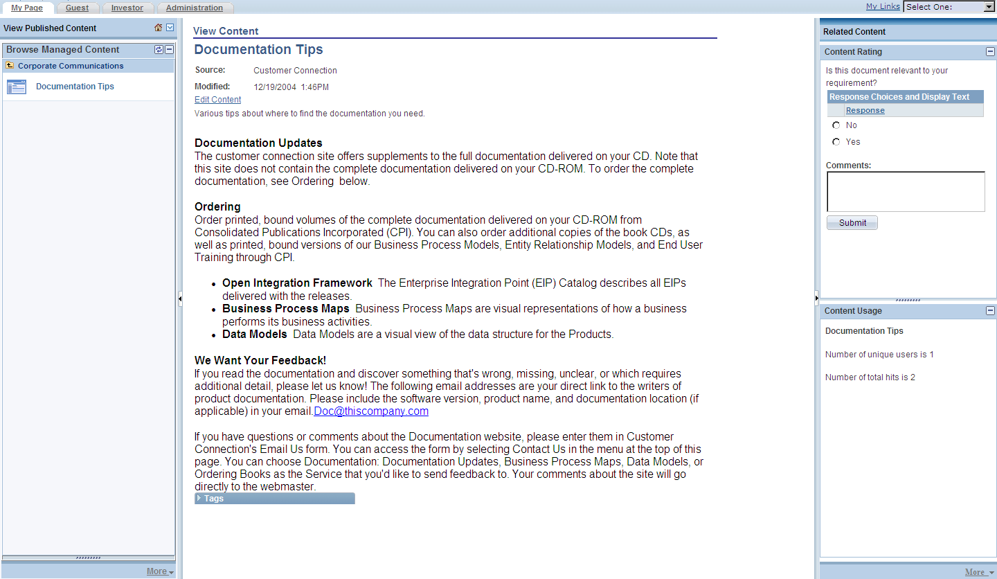 If the Enable Content in WorkCenter check box is selected on the Installation Options page, when you access published content by browsing content folders, viewing search results, or using a content pagelet on your home page, the content appears in the View Published Content WorkCenter page. This applies to managed content and categorized content.