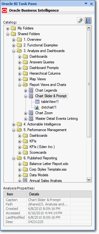 You can start Microsoft Excel and PowerPoint and use the Oracle BI menu or ribbon to sign in and display the Oracle BI Presentation Catalog. The Catalog browser is presented as a pane in Excel and PowerPoint to browse analyses, both user-created and shared, as shown in Figure B-1. You can also display the individual views that are available for each analysis.