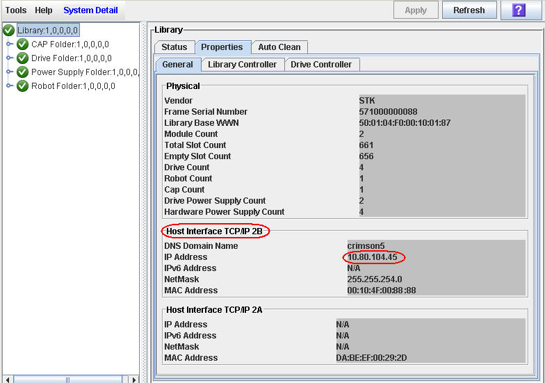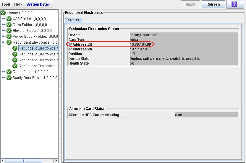 Note – If the library also includes the Redundant Electronics feature, the IP addresses displayed are for the active controller card only.