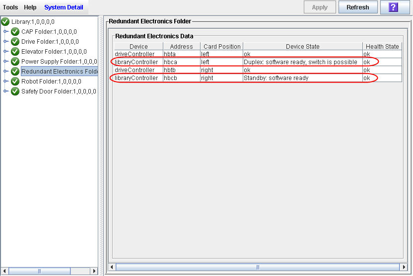 The other library controller card indicates “Standby: software ready”. This is the current alternate controller.