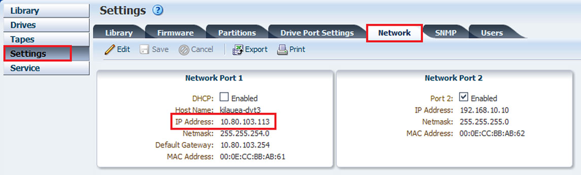 The library IP address is displayed under the Network Port 1 section. (The Network Port 2 section is reserved for service use.)