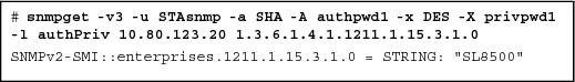 snmpget -v3 -u SNMP_user -a SHA -A auth_password-x DES ‑X priv_password -l authPriv library_IP_addr 1.3.6.1.4.1.1211.1.15.3.1.0