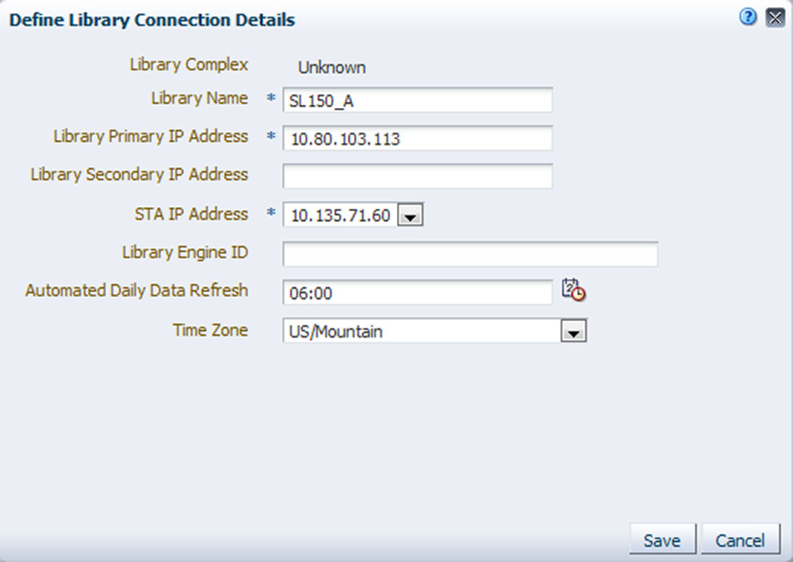 Library Primary IP Address – Enter the IP address of the primary public port on the library. For SL500 libraries, this is the 1B port. For SL3000 and SL8500 libraries, this is the 2B port. For SL150 libraries, this is Network Port 1. See “Retrieve the Library IP Address”.