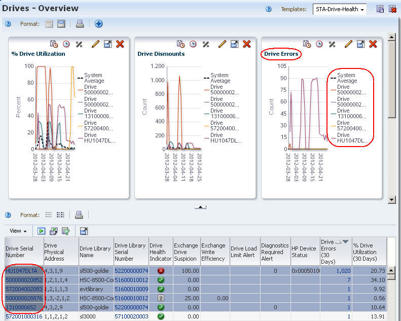 A running 30-day sum of drive errors is shown in the table and one of the graph panes.