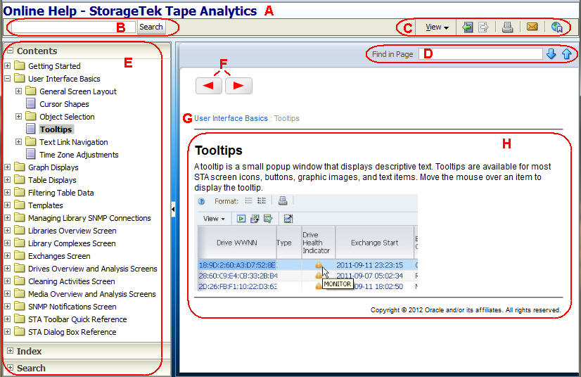 Provides three navigation tabs: Contents, Index, and Search. See the following topics for details: