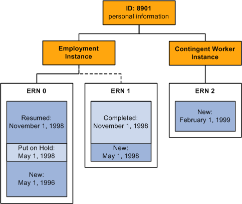 Employment record numbers (ERNs), in combination with a person's ID, uniquely identify a person's job data records. The system distinguishes between a person's organizational instances by using a new ERN when you create a new instance.