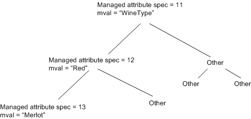 In this hierarchy, the Red attribute (with an ID of 12) is an ancestor of the Merlot attribute (ID of 13). A search against the WineType attribute for the keyword merlot matches any records assigned the attribute value 13. But a search in WineType for red merlot does not match these records, because record search does not normally consider implicit ancestor attribute value assignments.
