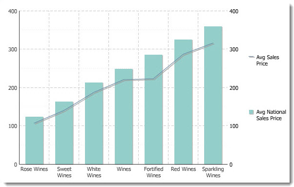 It produces a line bar combo chart comparing the "Avg Sales Price" metric to the "Avg National Sales Price" for each varietal: