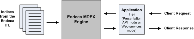 The MDEX Engine uses proprietary data structures and algorithms that allow it to provide real-time responses to client requests. The MDEX Engine stores the indices that were created by the Endeca Information Transformation Layer (ITL). After the indices are stored, the MDEX Engine receives client requests via the application tier, queries the indices, and then returns the results.