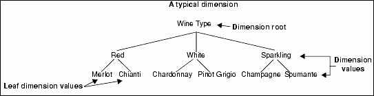 A dimension is a collection of related dimension values, organized into a tree. The top-most dimension value in a dimension tree is known as the dimension root. A dimension root always has the same name as its dimension.