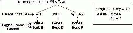 In the example below, a navigation query on the Red dimension value produces a result set of Bottles A and B.