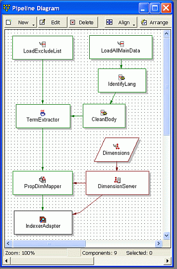 The pipeline for your specific implementation such as a record manipulator to pre-process records, and perhaps another one to post-process the records. For example, if you are crawling a Web site, you will probably include a record manipulator to strip the records of HTML code before the terms are extracted from the records.