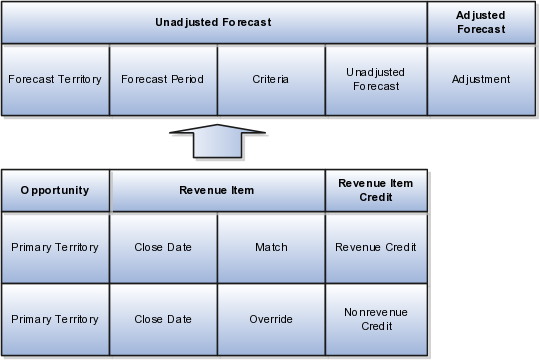 This figure shows the components for a territory forecast. Revenue items from opportunities form the unadjusted forecast. If the revenue item has multiple sales credits, then the revenue item is visible across multiple forecasts. Salespeople add adjustments to the forecast. Adjustments can be applied at a summary or item level.
