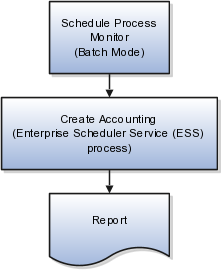 The Create Accounting process is an Enterprise Scheduler Service (ESS) process. It can be submitted as a request from the Scheduled Processes Monitor window to create journal entries for a batch of events. It has input parameters that determine the execution mode and the selection criteria for events.