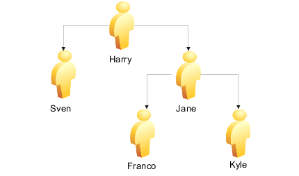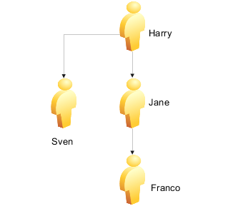 In a person-level manager hierarchy, Harry's data instance set includes the person records for Sven, Jane, Franco, and Kyle.