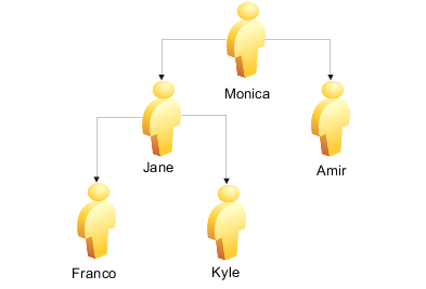 In a person-level manager hierarchy, Monica's data instance set includes the person records for Jane, Franco, Kyle, and Amir.