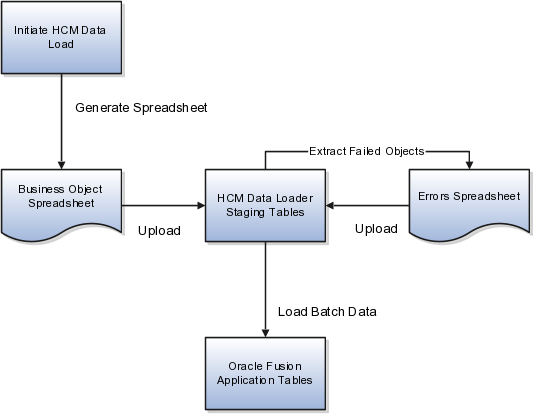 HCM Spreadsheet Data Loader enables you to upload business objects to Oracle Fusion Human Capital Management (HCM) from a spreadsheet. Business objects that you can upload include person and assignment data, grades, jobs, benefit plan types, content items, performance templates, and rating models. You can view the complete list of supported business objects on the Initiate Data Load page, where objects appear in the recommended load order.