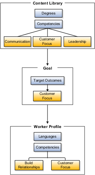 The figure shows how a content item, in this case the competency Customer Focus, is added from the content library to a goal as a target outcome, and then to the worker profile when the goal is completed.
