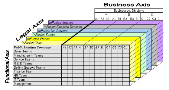 In the figure above, a separate card represents a series of registered companies. Each company, including the public holding company, InFusion America, must be registered in the countries where they do business. Each company consists of various divisions created for purposes of management reporting. These are shown as vertical columns on each card. For example, a group might have a separate company for each business in the United States (US), but have their United Kingdom (UK) legal entity represent all businesses in that country. The divisions are linked across the cards so that a business can appear on some or all of the cards. For example, the air quality monitoring systems business might be operated by the US, UK, and France companies. The list of business divisions is on the Business Axis. Each company's card is also horizontally striped by functional groups, such as the sales team and the finance team. This functional list is called the Functional Axis. The overall image suggests that information might, at a minimum, be tracked by company, business, division, and function in a group environment. In Oracle Fusion Applications, the legal structure is implemented using legal entities.