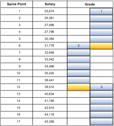 You can use grade ladders to meet the requirements of a grade structure with spine points. This example shows a grade structure with spine points that is similar to one for university workers in the UK.