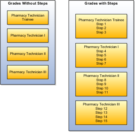 To create the grade ladder for the grade structure with spine points, you must create a ladder using grades with steps. When you create the rates, use annual salary amounts. The following table lists the grades, steps, and rates to add to the ladder.