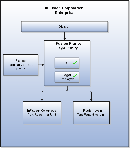 InFusion requires legal entities with legal employers, payroll statutory units, tax reporting units, and legislative data groups for the US, UK, France, Saudi Arabia, and UAE, in order to employ and pay its workers in those countries.