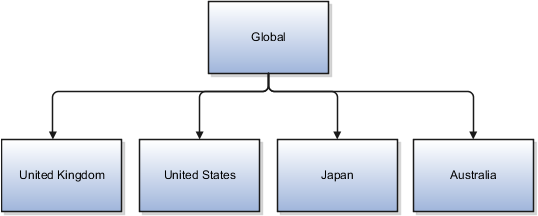 Using the predefined tree structure for a geography tree, you create a version of a geography tree to represent the countries in which your organization operates. Although you can create multiple versions, you can create only one geography tree, and the tree can have only two levels in the hierarchy. You can have only one top-level node for a geography tree.
