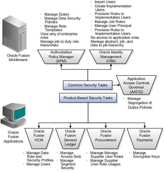 Security setup and administrative tasks performed by product administrators and implementation consultants, such as managing HCM security profiles, are presented in the documentation for those products.