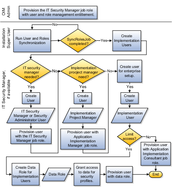 The figure shows the task flow from provisioning the IT Security Manager job role with the user and role management entitlement to creating and provisioning implementation users for enterprise setup.