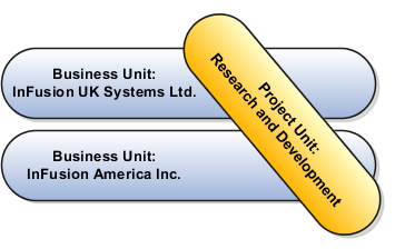 You can partition financial data using business units while sharing a single approach to project management across all business units. The following diagram shows two business units, one from the United Kingdom (UK) and one from the United States (US). These business units have the same research and development processes, so a single project unit is used by both business units to facilitate common project management practices.