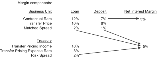 To illustrate, assume that the bank has issued a short-term time deposit costing 7% and funded a long term loan yielding 12%. The deposit costs 100 basis points (bps) less than purchased funds with a similar maturity, and the loan has a yield 200 bps higher than the bank would pay for funds of the same maturity. This graphic illustrates the margin components: