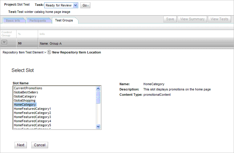 You can test new repository content in a slot on a site page. You can test one or more items from a content repository. Repository content is any item stored in any content repository used by your application. This could include images or text.