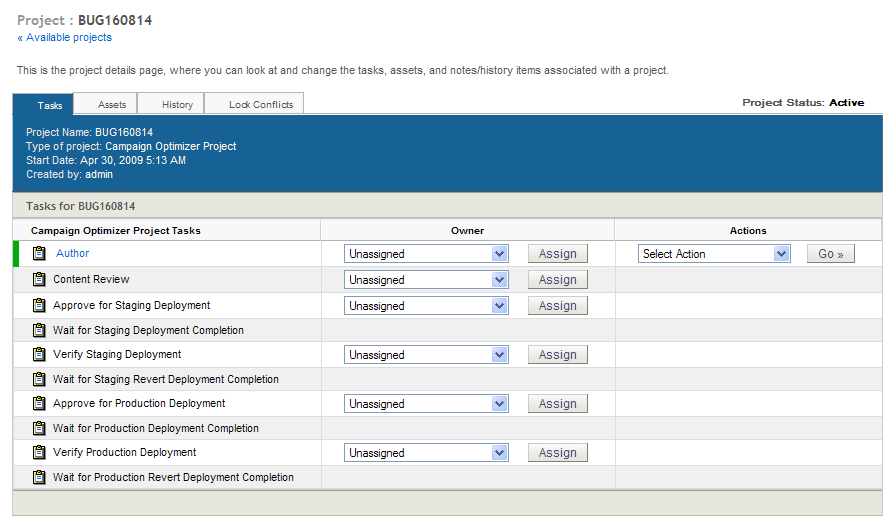 Note that the Wait for… tasks and the Revert Failed Deployment tasks represent stages in the workflow where you wait for the system to complete the specified activity. You cannot take any action until the stage is complete, so no dropdown menu appears for these tasks in the Actions column. For more information on these tasks, refer to the ATG Content Administration Guide for Business Users.