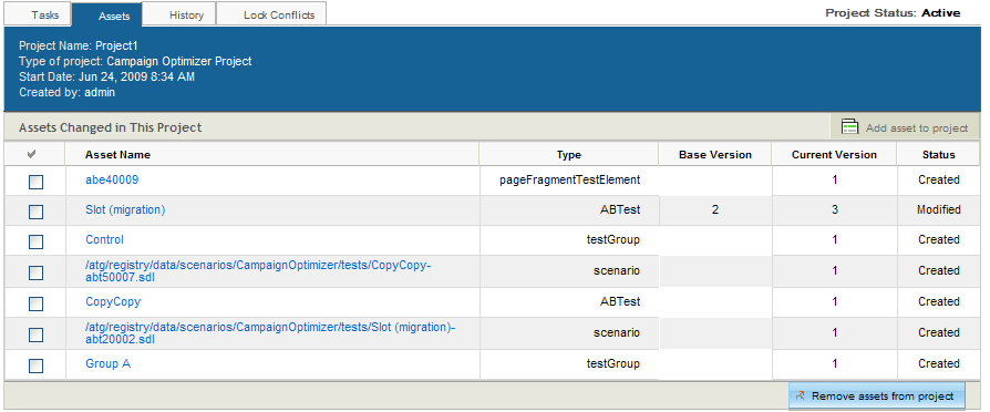 The Assets Tab displays all the assets that are included in your test, such as groups, page fragments, images, segments, and folders. Although you do not add folders to a test explicitly, any folder associated with other test assets is automatically added to the project so it can be deployed.