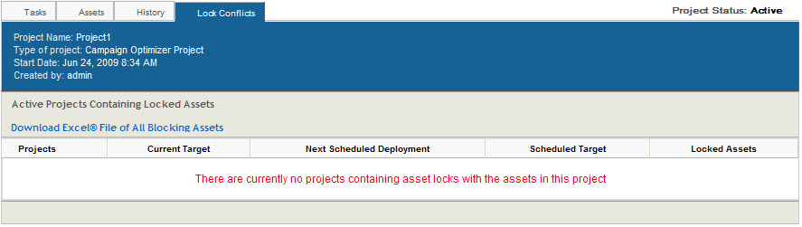 When a project is in the deployment stage of a workflow, its assets are locked, and they remain locked until the project is checked in by the system, which occurs when deployment is complete. During that time, other projects cannot deploy those assets. If you attempt to deploy an ATG Campaign Optimizer project and receive asset lock errors, you can use the Lock Conflicts tab to view a list of all the projects that are holding assets locks for any of the assets in the current project. For more information, refer to the ATG Content Administration Guide for Business Users.