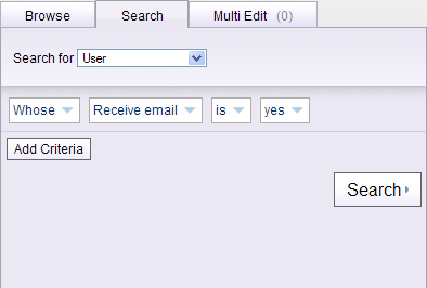 Use the Search tab to find and display specific items in the users, organizations, and roles interfaces. For example, to find all user profiles whose Receive Email property is currently set to Yes, you would do the following: